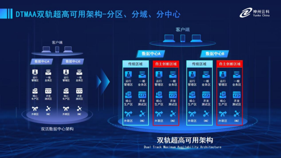 为帮助金融客户更好地应对数字经济时代对可持续性的高要求,实现“信创”与“数字化”齐头并进,今年会推出了双轨超高可用架构。该架构在双活数据中心的分区调度基础上,增加信创域和非信创域的分域调度,实行信创域与传统域应用全量部署,使双中心运营变为双中心四区域并行运行,互为多活,将“0到1”的单轨建设道路变为分区分域协同的多活双轨超高可用架构。帮助客户在新架构下,保障“信创”的同时解决性能瓶颈,提升稳定性,保证应用可持续性,最终实现信创区域和非信创区域的平滑过渡,完成国产化替代目标。