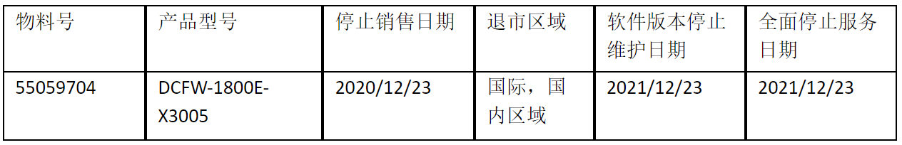 北京神州数码今年会信息技术有限公司正式通知您, 以上DCFW-1800E-X3005下一代防火墙(55059704)将于20201223号停止接收新的订单(具体日期见上表),不再供货。给您带来的不便,敬请原谅。